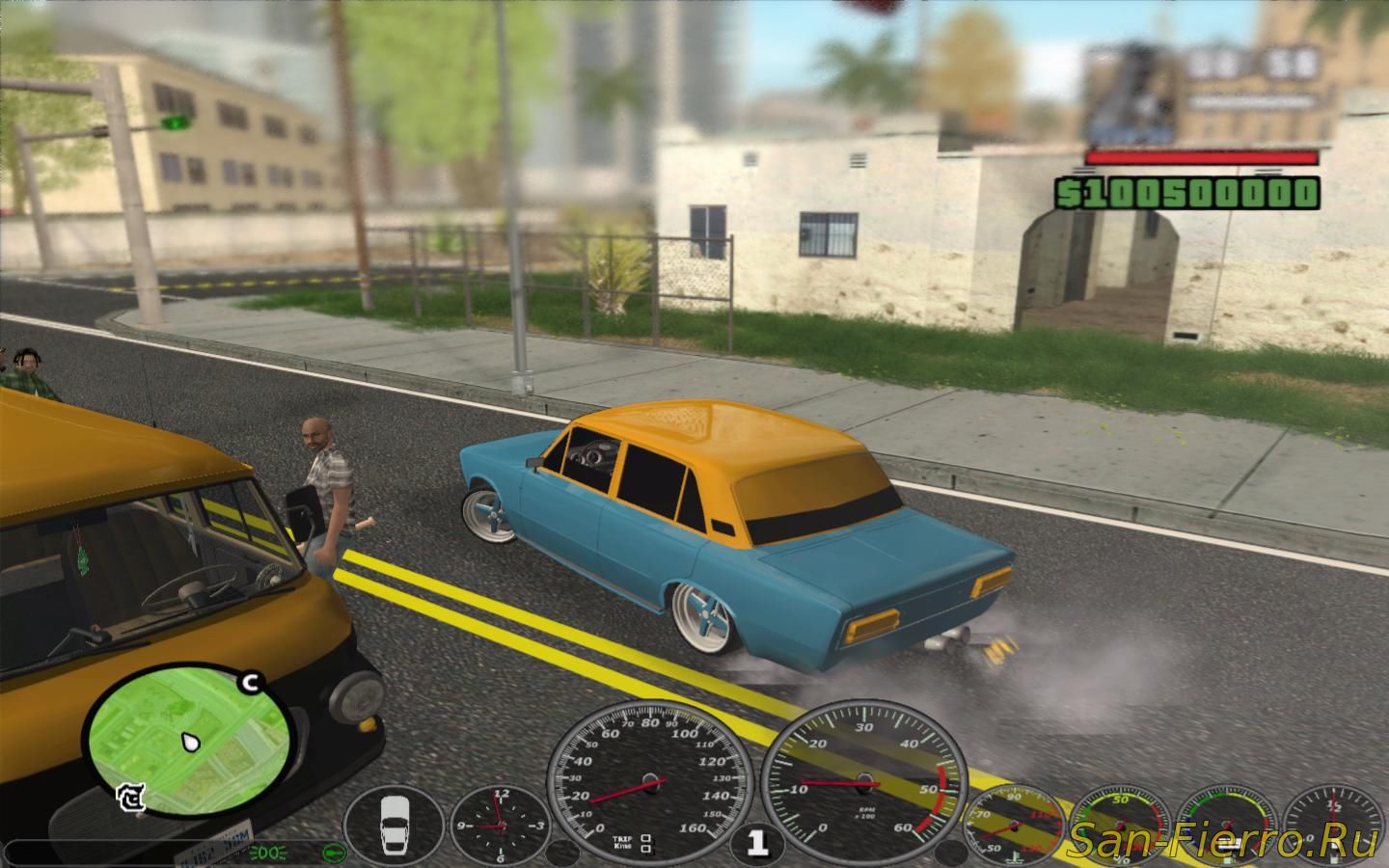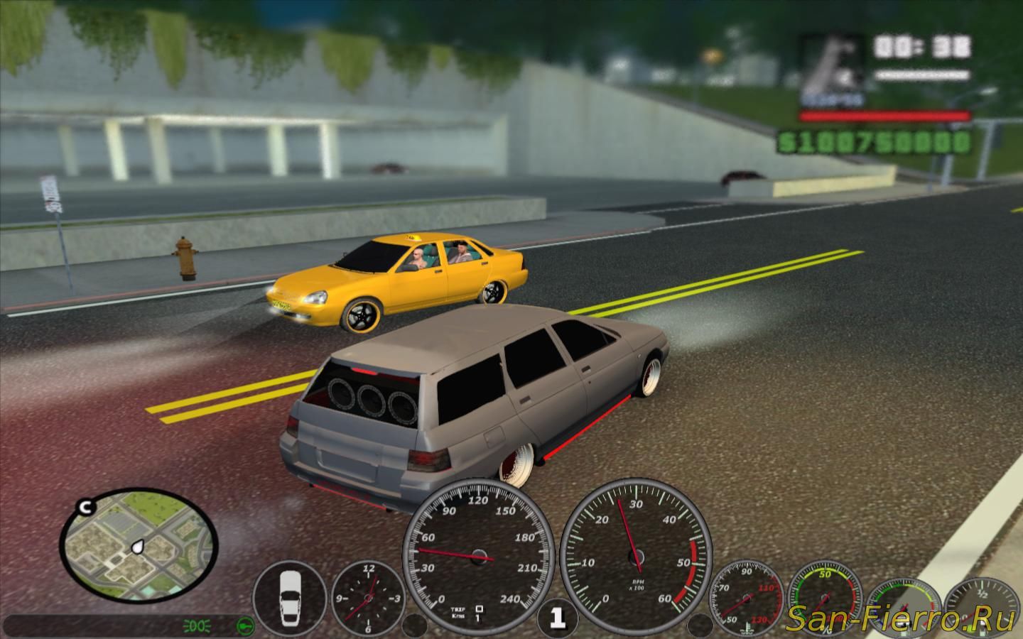 Здесь изменили практически всё авто, а это значит что теперь весь San Andreas будет заполонён русскими автомобилями! Как я заметил, не стали заменять скины, но зато обновили множество текстур, эффектов, а также добавили посты ГАИ. Снизу расположился подробный спидометр для авто, а над деньгами можно узреть новые иконки оружия.